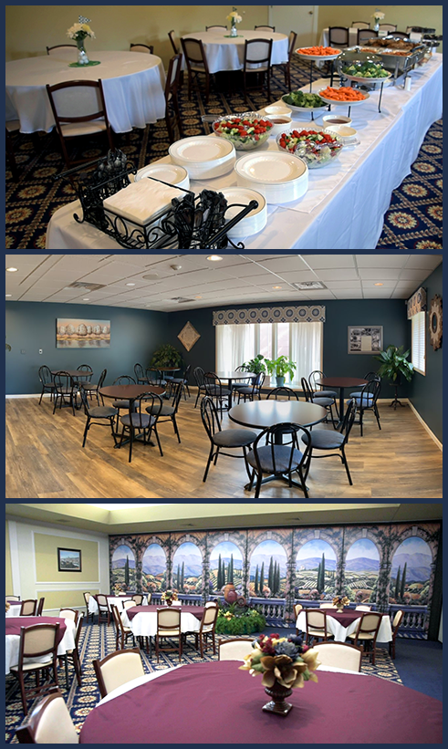 We will assist with catering options, whether it will be our caterer or a caterer of your choice. Our catering choices include a variety of options including anything from simple hor d'ourves to a complete meal selection.
